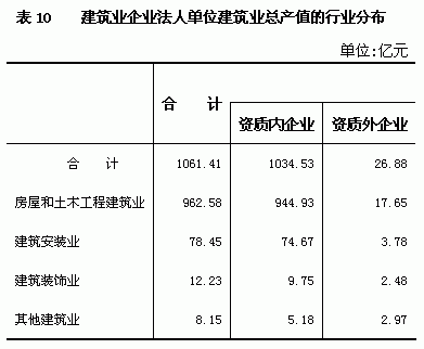 在建筑业企业法人单位的建筑业总产值中,房屋和土木工程建筑业占90.7%;建筑安装业占7.4 %;建筑装饰业占1.1%;其他建筑业占0.8%(详见表10)。