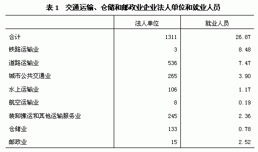 在交通运输、仓储和邮政业企业法人单位中,交通运输业占88.7%,仓储业占10.2%,邮政业占1.1%;在法人单位就业人员中,交通运输业占87.7%,仓储业占2.9%,邮政业占9.4%(详见表1)。