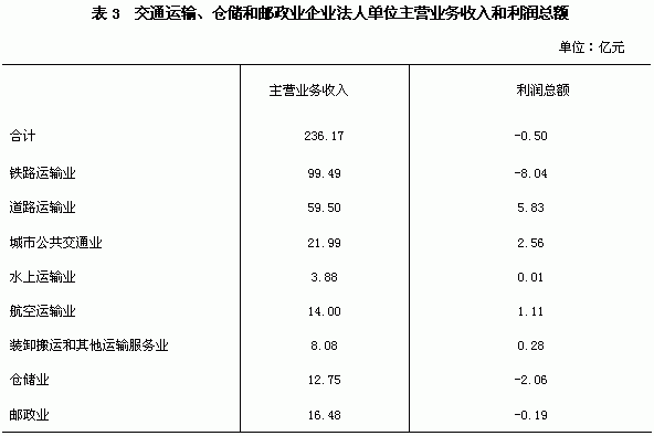 交通运输、仓储和邮政业企业法人单位利润总额-0.50亿元。其中,交通运输业1.75亿元,仓储业-2.06亿元,邮政业-0.19亿元。