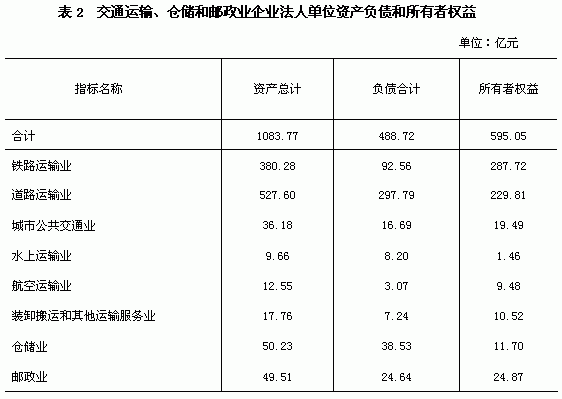 2004年末,交通运输、仓储和邮政业企业法人单位资产合计1083.77 亿元,其中,交通运输业占90.8%,仓储业占4.6%,邮政业占4.6%;负债合计488.72 亿元,其中,交通运输业占87.1%,仓储业占7.9%,邮政业占5.0%;所有者权益合计595.05 亿元,其中,交通运输业占93.8%,仓储业占2.0%,邮政业占4.2%。(详见表2)。