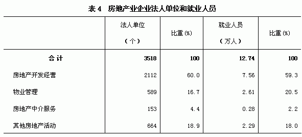 2004年末,全省共有房地产业企业法人单位3518个,年末就业人员12.74万人(详见表4);房地产业个体经营户1363户,就业人员0.23万人。