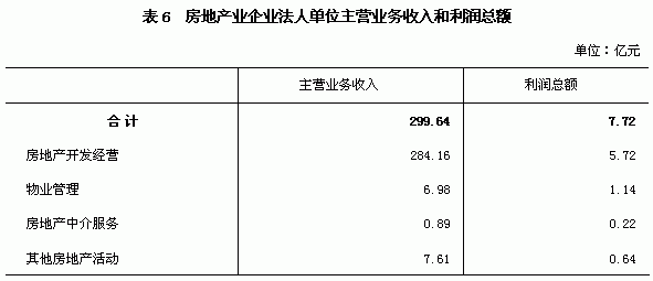 2004年,房地产业企业法人单位主营业务收入为299.64亿元,利润总额7.72亿元(详见表6)。