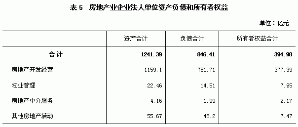 2004年末,房地产业企业法人单位资产合计为1241.39亿元,负债合计为846.41亿元,所有者权益合计为394.98亿元。房地产业企业法人单位资产负债率为68.2%,分行业看,房地产开发经营业为67.4%,物业管理业为64.6%,中介服务业为47.8%,其他房地产业为86.6%(详见表5)。