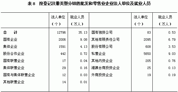在批发和零售贸易业法人企业就业人员中,国有、国有联营和国有独资公司共占27.5%,集体、集体联营和股份合作企业共占14.3%,私营企业占25.7%,其余类型企业共占32.5%(详见表8)。