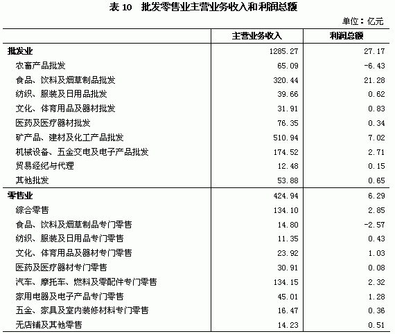 2004年全部批发零售业企业法人单位主营业务收入1710.93亿元,利润总额33.46亿元(详见表10)。