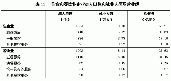 2004年全省住宿和餐饮业企业法人单位2625个,就业人员14.32万人,全年营业额[3]91.54亿元(详见表11)。