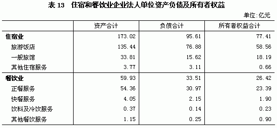 2004年末,全部住宿和餐饮业企业法人单位资产合计为232.95亿元,负债合计为129.12亿元,所有者权益合计103.83亿元。住宿和餐饮业企业法人单位的资产负债率为55.4%,分行业看,住宿业为55.3%,餐饮业为55.9%(详见表13)。