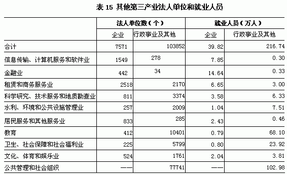2004年末,全省共有从事其他第三产业[4]的法人单位11.14万个,就业人员256.56万人,其中,企业法人单位7571个,从业人员39.82万人,行政事业及其他非企业单位10.39万个,就业人员216.72万人。全省共有从事其他第三产业个体经营户39.92万户,就业人员64.37万人。单位数和就业人员的行业分布详见表15。