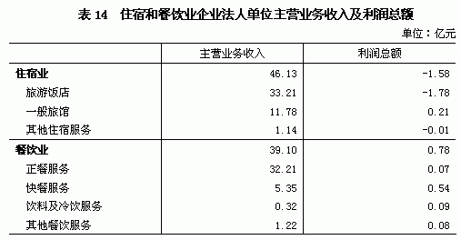 2004年全部住宿和餐饮业企业法人单位主营业务收入85.23亿元,利润总额-0.8亿元(详见表14)。