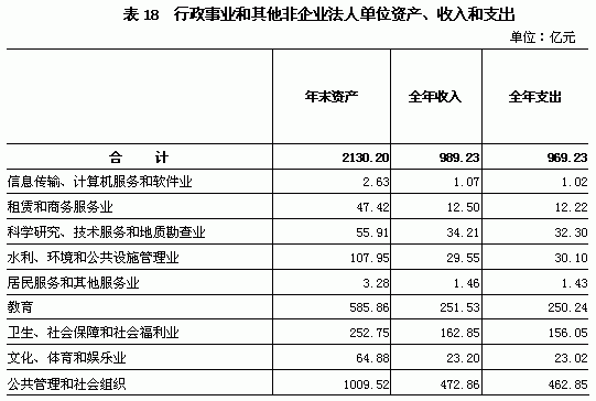2004年末,其他第三产业中的行政事业和其他非企业法人单位年末资产合计2130.20亿元,全年收入989.23亿元,全年支出969.23亿元(详见表18)。