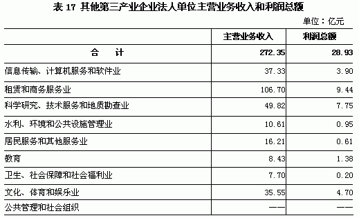 2004年末,其他第三产业企业法人单位的主营业务收入272.35亿元,利润总额28.93亿元。主营业务收入中,信息传输及计算机服务和软件业、租赁和商务服务业、科学研究及技术服务和地质勘查业所占比重分别是13.7%、39.2%、18.3%,三个行业合计占71.2%。利润总额中,三个行业分别占13.5%、32.6%、26.8%,合计占72.9% (详见表17)。