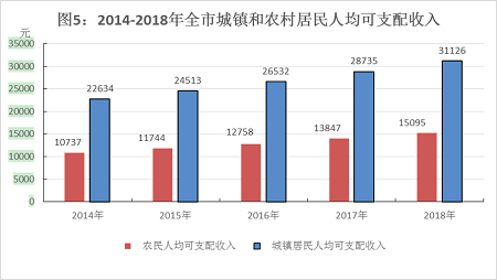 2018年全市城镇居民人均可支配收入31126元,比上年增长8.3%;城镇居民人均消费支出24766元,增长4.2%。农村居民人均可支配收入15095元,增长9.0%;农村居民人均消费支出13960元,增长4.1%。