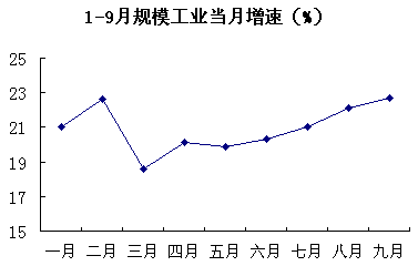 今年以来,我省规模工业一直保持了快速增长的势头,1-9月当月增速一直保持在18.5%以上,9月份更是达到了22.7%,呈持续快速发展的态势。