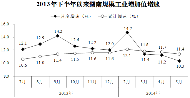 (一)工业生产总体平稳,但增速逐渐回落。1—5月,全省规模工业增加值累计同比增长11.4%,增幅比全国平均水平高2.7个百分点,居全国第7位,中部六省第4位。虽然1—5月增速总体保持平稳运行,增幅比去年同期高1个百分点,但比去年全年低0.2个百分点,并且在1—2月12.1%的基础上逐渐回落,1—5月比1—2月累计下滑了0.7个百分点,比1—4月下滑了0.3个百分点。从月度增速看,除年初的2月份外,今年前5个月总体延续了上年四季度以来的下行走势。全省规模增加值月度增速在去年三季度末达到14.2%后,在四季度持续下滑至12.0%;而今年在2月份 14.7%的基础上又开始了持续下行,3—5月各月增速分别为11.4%、11.2%和10.3%,增幅均低于去年12月份的水平。