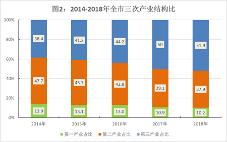 全市三次产业结构由上年的10.9:39.1:50.0调整为10.2:37.9:51.9。第一产业比重下降0.7个百分点,第二产业比重下降1.2个百分点,第三产业比重上升1.9个百分点。