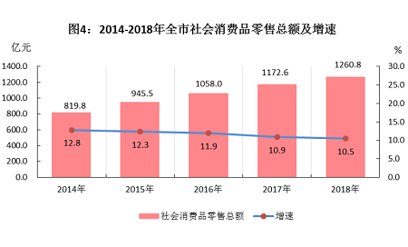 全市社会消费品零售总额1260.8亿元,增长10.5%。分地域看,城镇社会消费品零售额994.7亿元,增长10.3%;乡村社会消费品零售额266.1亿元,增长11.2%。