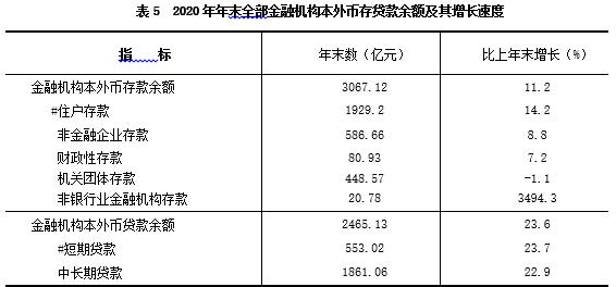 年末全部金融机构本外币各项存款余额3067.12亿元,比上年增长11.2%。其中:住户存款1929.2亿元,增长14.2%;非金融企业存款586.66亿元,增长8.8%;非银行业金融机构存款20.78亿元,增长3494.3%。全部金融机构本外币各项贷款余额2465.13亿元,增长23.6%。其中:短期贷款553.02亿元,增长23.7%;中长期贷款1861.06亿元,增长22.9%。