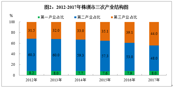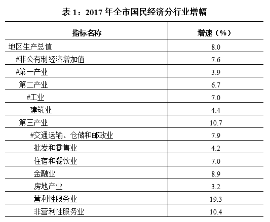 全市三次产业结构由2016年的7.9:53:39.1调整为8:48:44,第一产业和第三产业占比分别较上年同期提升0.1个和4.9个百分点,第二产业占比回落5个百分点。第一、二、三产业对GDP的贡献率分别为3.6%、47%和49.4%。