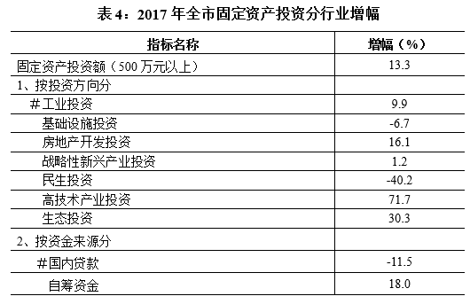 全市固定资产投资比上年增长13.3%,分别高于全国、全省6.1个和0.2个百分点。分经济类型看,国有投资下降10.8%;非国有投资增长29.5%。分产业类型看,第一产业投资增长88.1%;第二产业投资增长10%,其中,工业投资增长9.9%;第三产业投资增长11.5%。分投资方向看,高技术产业投资增长71.7%;生态投资增长30.3%;战略性新兴产业投资增长1.2%;基础设施投资下降6.7%。全市亿元以上项目494个,比上年增加51个;新开工亿元以上项目478个,比上年增加216个。