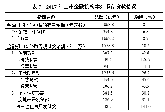 年末,全市金融机构本外币存款余额3068.8亿元,比上年增长8.5%。其中,住户存款余额1662.2亿元,增长8.7%;非金融企业存款余额954.8亿元,增长6.8%。金融机构本外币贷款余额1578.8亿元,增长18.2%。余额存贷比为51.4%。
