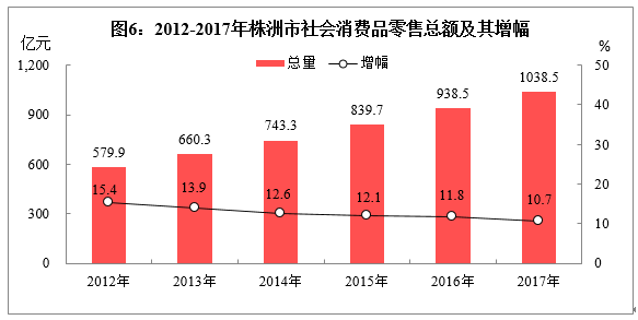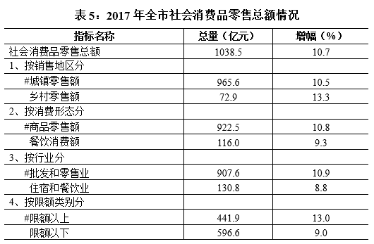 全市社会消费品零售总额1038.5亿元,比上年增长10.7%,分别高于全国、全省0.5和0.1个百分点。分经营地看,城镇零售额965.6亿元,增长10.5%;乡村零售额72.9亿元,增长13.3%。分消费形态看,商品零售额922.5亿元,增长10.8%,餐饮消费额116亿元,增长9.3%。分行业看,批发和零售业907.6亿元,增长10.9%,住宿和餐饮业130.8亿元,增长8.8%。分限额类别看,限额以上441.9亿元,增长13%,限额以下596.6亿元,增长9%。