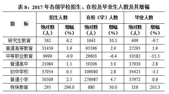 年末全市有普通高校11所。普通高等教育研究生毕业生409人,普通高等教育毕业生27295人,中等职业教育毕业生10582人,普通高中毕业生17930人,初中学校毕业生34421人,普通小学毕业生37972人,在园幼儿14.8万人。小学适龄儿童入学率100%,九年义务教育巩固率96.4%。各类民办学校1022所,民办学校在校学生17.7万人。发放高校国家奖学金、助学金2859万元,落实义务教育保障资金4.4亿元。