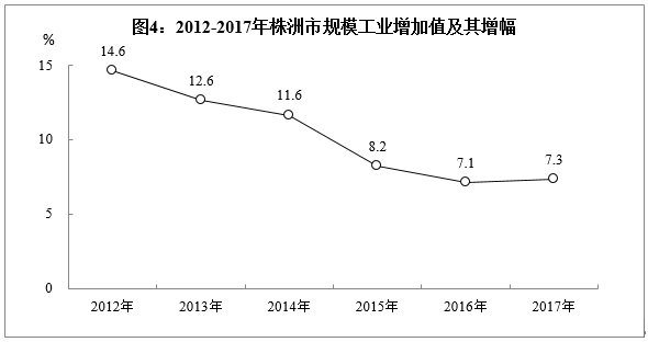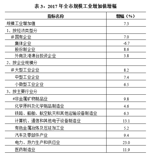 全市工业增加值比上年增长7%。其中,规模工业增加值增长7.3%,高于全国0.7个百分点,与全省持平。高加工度工业增加值占工业增加值的比重为42.7%,增长9.8%;园区规模工业增加值占比74.4%,增长10.3%。在规模工业中,非公有制企业增加值占比69.8%,增长10.3%;分行业看,轨道交通装备业、汽车及零部件业、航空装备业等三大动力产业增加值增长7.1%,计算机、通信和其他电子设备制造业增长13.1%,非金属矿物制品业增长9.8%,化学原料及化学制品制造业增长4.6%。