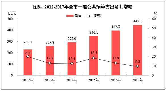 全市一般公共预算支出445.1亿元,增长9.3%。其中,财政用于民生支出327.4亿元,增长10.8%;财政八项支出340.7亿元,增长13.3%。