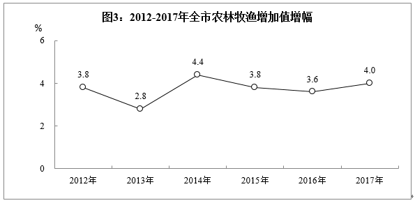 全市农林牧渔业增加值比上年增长4%。其中,农业增加值增长3.5%;林业增加值增长4.5%;畜牧业增加值增长4.4%;渔业增加值增长3.2%;农林牧渔服务业增加值增长8.9%。