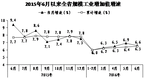 (一)生产运行总体平稳。上半年,全省规模工业增加值同比增长6.5%,比一季度加快0.3个百分点,比全国平均水平快0.5个百分点。从月度看,2—5月各月增速分别为6.0%、6.3%、6.5%和6.9%,呈逐月回升态势,6月当月同比增长6.6%,略有回调。上半年,全省规模工业生产总体呈企稳回升态势,但增速仍处于历史低位,分别比上年同期和全年低1.2个和1.3个百分点。