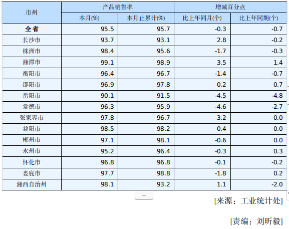 2025年湖南省分市州规模工业产品销售率(1-9月)