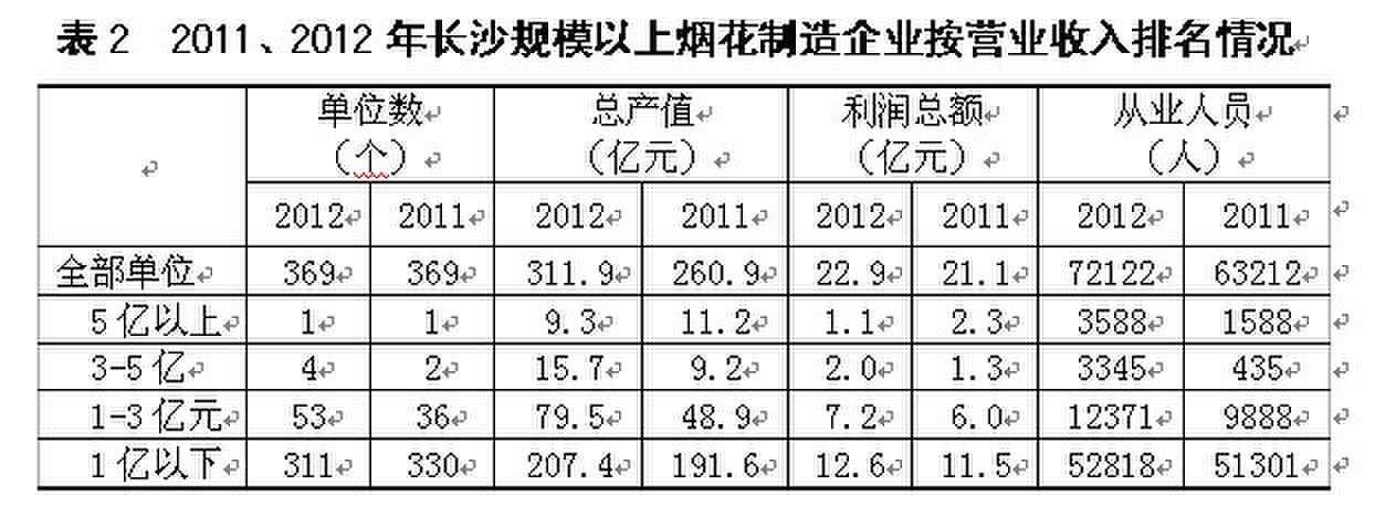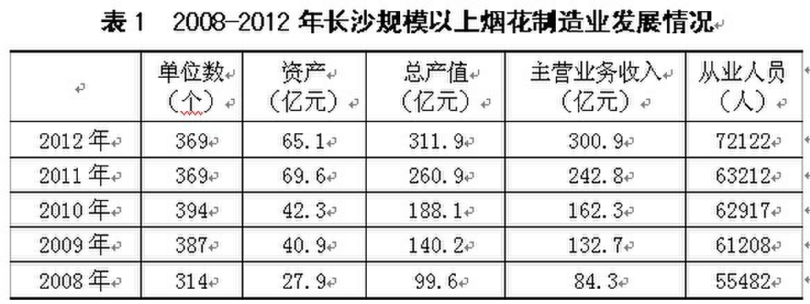从2012年发展情况看,全市拥有规模以上烟花制造企业369家,实现总产值311.9亿元,同比增长19.6%;实现主营业务收入300.9亿元,同比增长23.9%;实现利润总额22.9亿元,同比增长8.5%;创税44.4亿元,同比增长28.3%;从业人员72122人,占全市第二产业从业人员的比重为4.8%。从历年发展情况看,2008-2012年全市规模以上烟花制造企业由314家增加到369家,增加55家;拥有资产年均增长23.6%,总产值年均增长33.0%,企业平均规模由3172.0万元增加到8454.2万元。