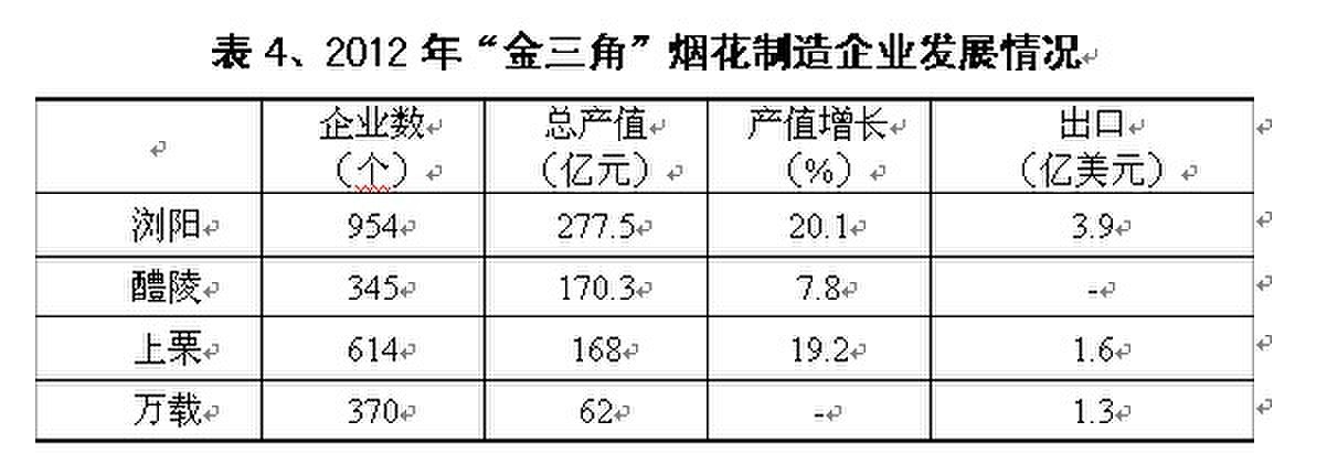 从以上数据我们可以看出,浏阳烟花制造业整体水平虽处于领先地位,且已通过研发无硫发射药新技术和关停落后烟花制造企业等方面来提升核心竞争力,然而仍面临较大压力,各地区竞争态势越趋激烈。如2007-2012年浏阳烟花制造业产值年均增速低于醴陵;2012年浏阳烟花制造业产值增幅比上栗仅高0.9个百分点;而作为产值规模最小的万载,2012年其烟花制造业出口1.3亿美元,与上栗仅差0.3亿美元,出口产值占总产值的比重高于浏阳4.3个百分点。