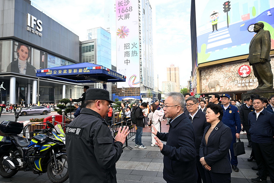 来到长沙市五一商圈,沈晓明察看长沙国际金融中心现场客流及交通秩序,检查消防站运行情况,并来到五一商圈安全运行智能管理指挥中心,了解人员密集场所安全维稳、大客流疏导及公共安全风险应对等工作情况。他指出,五一商圈人口流动大、安全风险高,要把风险排查抓得更紧一点、更密一点、更严一点,加强社会面巡逻防控,提高城市本质安全水平。
