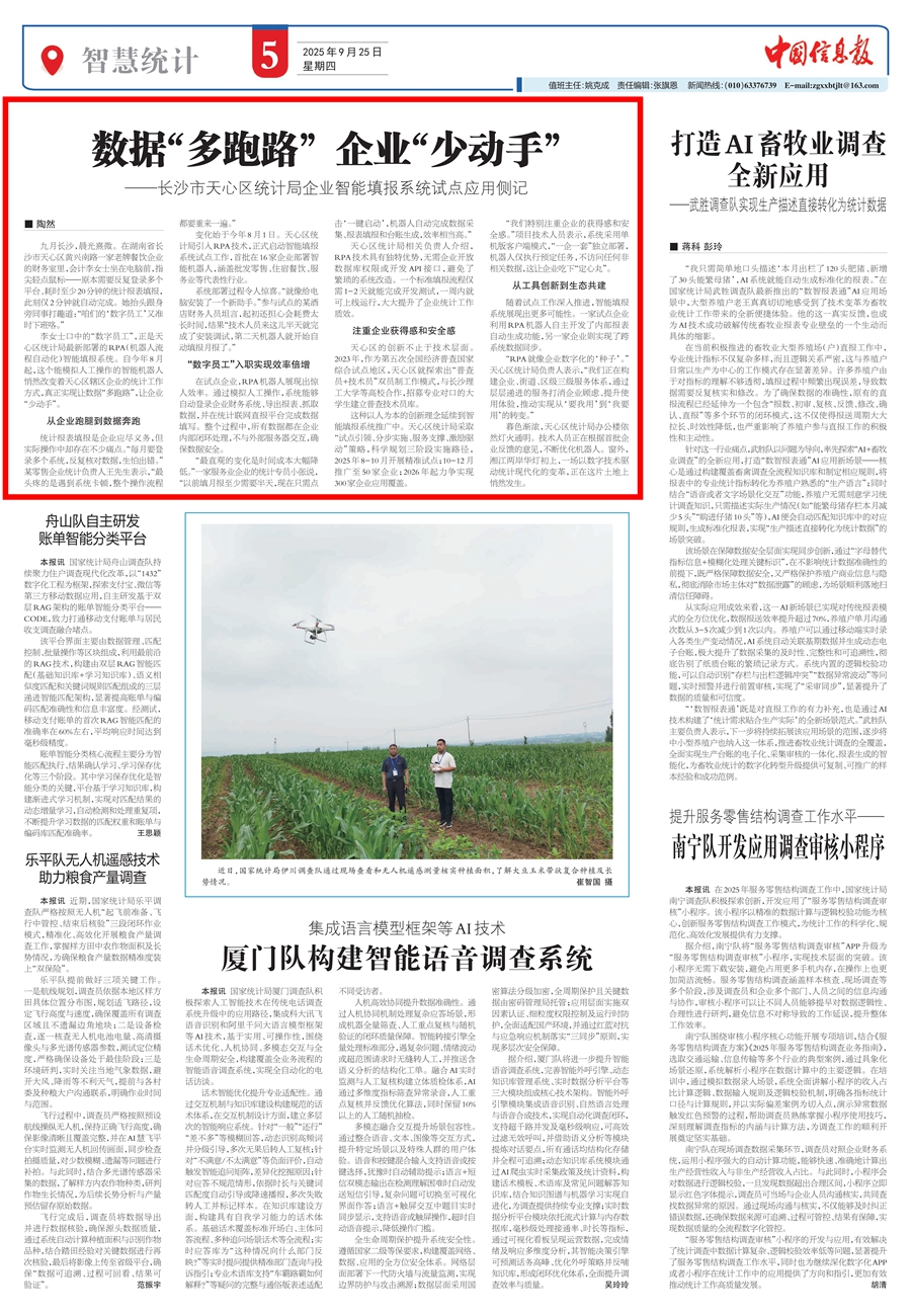 《中国信息报》智慧统计栏目头条刊发通讯《数据“多跑路”企业“少动手”——长沙市天心区统计局企业智能填报系统试点应用侧记》